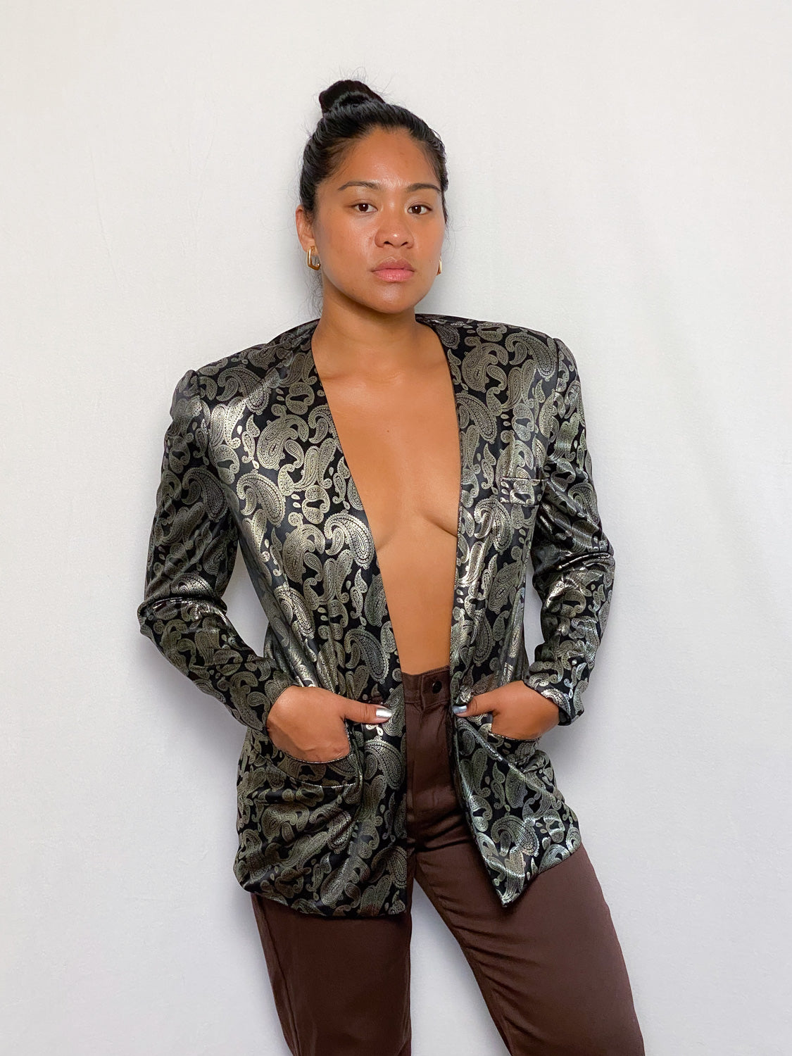 Vintage 90s Black and Silver Paisley Print Blazer.