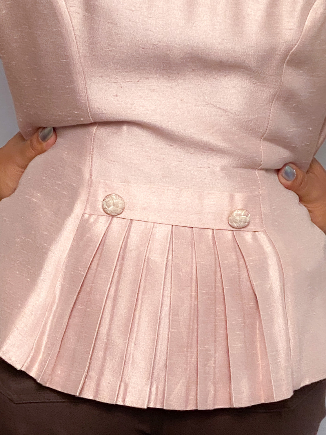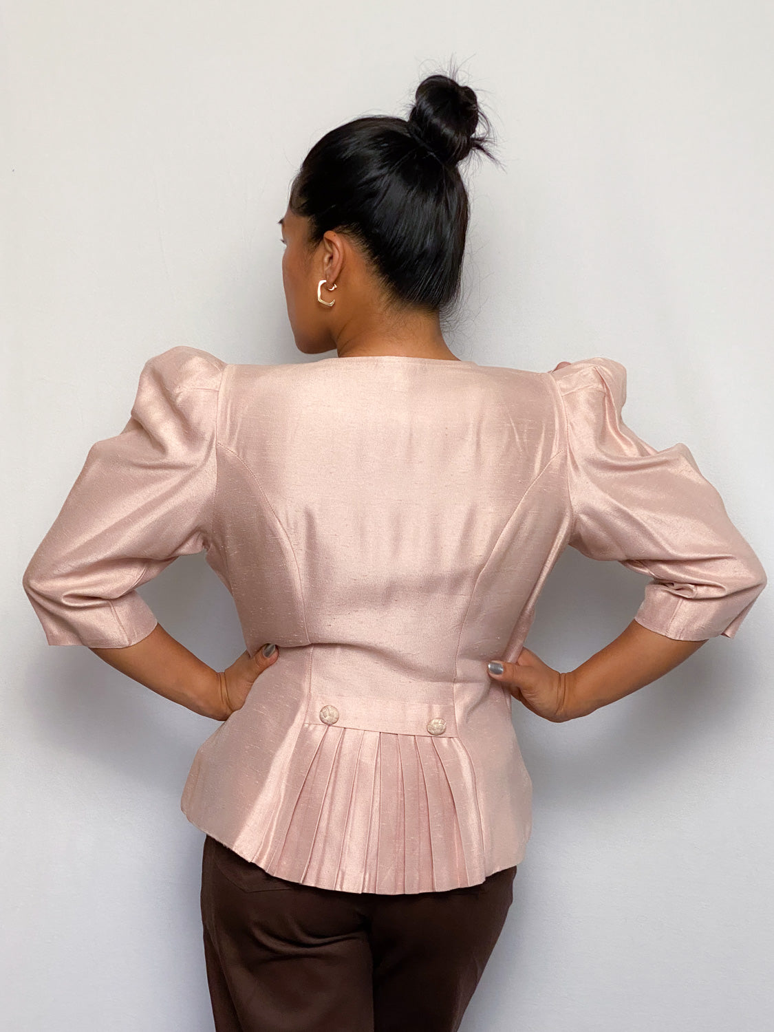 1980s Light Pink Pleated Lace Jacket features pleated shoulders with shoulder pads, three button detail at sleeve, pleated back with inset waist, single button closure, and beautiful lace detail at front of 3/4 sleeve.