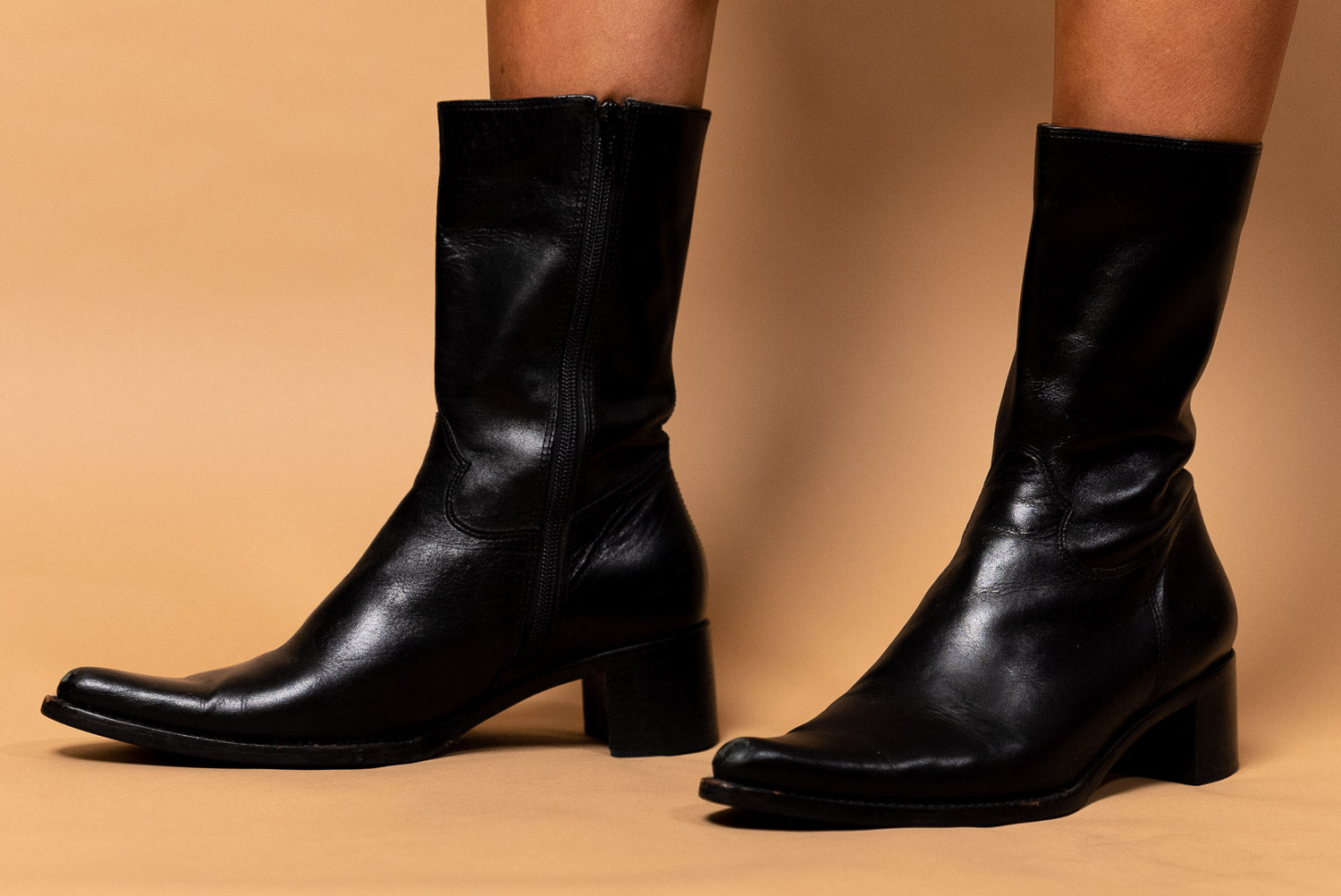 Black leather with zipper and small block heel.